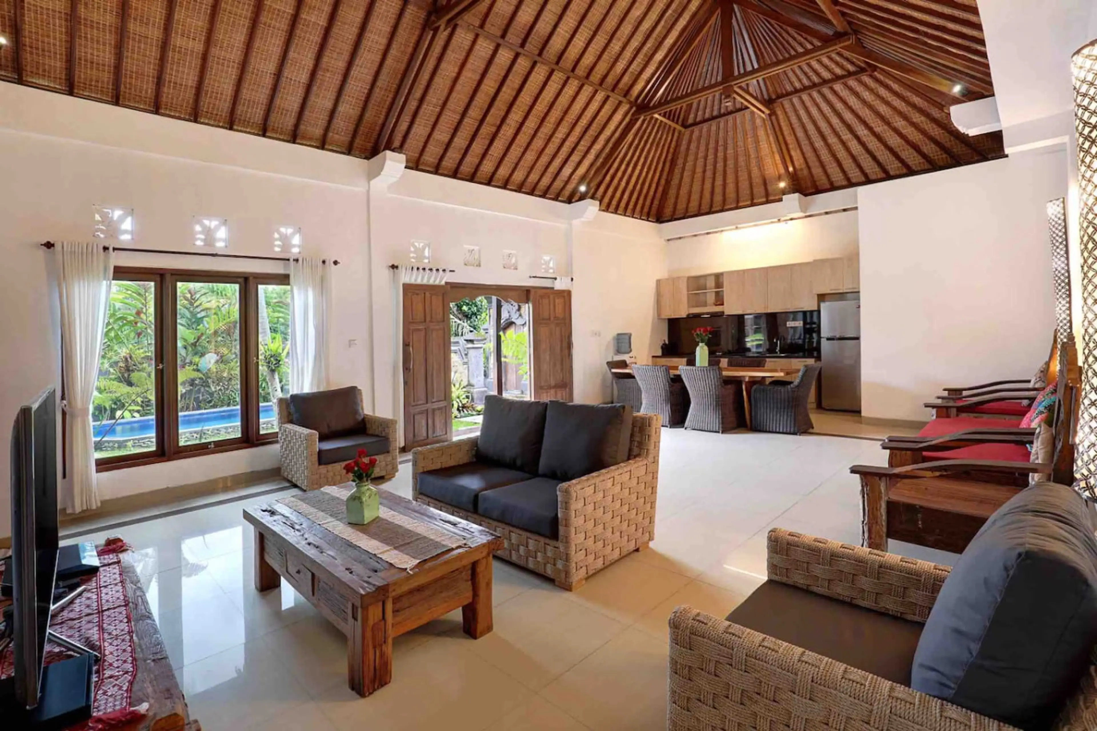 Positive: Établissement près du centre d ubud 20- 25min à pied. Mais en haute saison, une heure en voiture pour y arriver. Les portes ne ferment pas à clé. Paisible au fond d'un cul de sac. Personnel ok sauf qu en tant que touristes on s est fait avoir sur leurs prix... pris des petits déjeuners un peu excessif par rapport à ce qu il y a dans l'assiette. Service de taxi facture le double 1,3M pour un déplacement à 700k via grab... pour le reste propre , 1 chambre séparée du bâtiment principal.